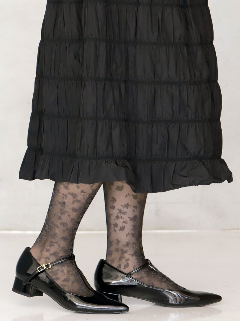 Meias até à panturrilha com padrão de folhas e cano alto que chama a atenção. Leves e modernas, dão um toque de frescura e originalidade ao visual do dia a dia.
