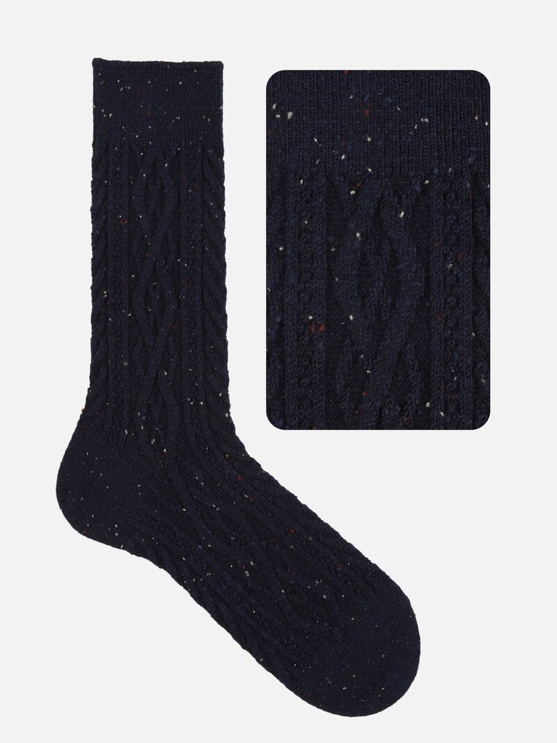 Meias de malha Aran com look flutuante. Eles criam um toque invernal semelhante ao de um suéter, com fios de cores contrastantes para um toque casual.